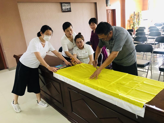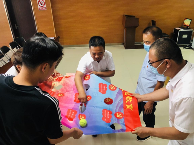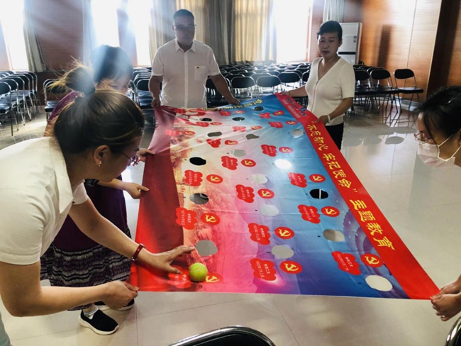 之后,组织党员们开展了团队建设拓展活动,在场的党员们分为两个小组,按照当日的活动主题将本组践行初心使命、做好职业教育的誓词书写到队旗上进行团队展示。一队围绕“立德树人”的教育任务,号召大家在拼搏中实现人生价值,为党的教育事业奋斗终生!二队围绕“为人民服务”的党的宗旨,号召大家团结一心、其利断金,众志成城、爱岗敬业。在目标的引领下,两队在精诚合作的基础上挑战了“党史地图”这一沟通协作项目,在有效沟通、默契配合的活动中凝练了教务学生党支部的团队意识,牢固了基层战斗堡垒的组织能力与战斗能力,以昂扬的姿态和饱满的精神在党的99岁生日时做出庄严承诺,为实现“两个一百年”的奋斗目标作出应有的贡献!