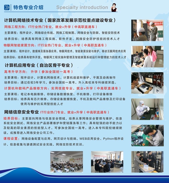 包头服务管理职业学校网络技术教研室始建于成立于1998年,现有计算机应用专业(高考方向)、计算机应用专业(计算机和数码产品维修方向)、计算机网络技术专业(网络工程方向)、计算机网络技术专业(物联网智能家居方向)和网络信息安全3个专业4个专业方向。全系现有全日制在校生近400余人,10个教学班;专职教师29人,高级教师13人,自治区级教学能手3人,包头市学科带头3人,包头市教学能手3人,软件工程师1人。