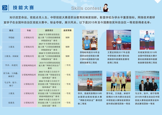 网络技术教研室坚持教学以学生为本、以德育人;办学以师为本、全程育人的办学理念。教研室全体教师团结一致,敬业、乐业,以培养学生掌握职业核心技能、提高学生就业能力为己任;精心教学,严格管理,保证教学质量。近年来在全国和自治区中职技能大赛中,网络技术教研室学生屡获佳绩,2016、2017、2018连续三年获得全国职业院校技能大赛计算机检测维修与数据恢复赛项铜牌;2019年获得全国职业院校技能大赛网络空间安全赛项银牌牌;2014年到2019年共荣获自治区中职技能大赛一等奖6个,二等奖5个,三等奖7个;同时在中职对口升学高考中取得的成绩也名列自治区各学校前茅,其中11、12、13、14、16届高考学生勇夺包头市对口升学高考状元,网络技术教研室的各专业办学成果显著,赢得了同行和社会各界的赞誉。