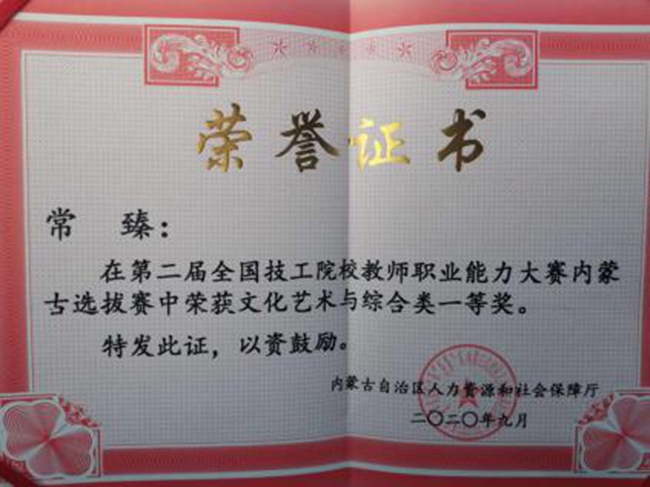 包头服务管理职业学校艺术设计教研室常臻老师和学前教育教研室谢林洁老师参加了文化艺术与综合类赛项的比赛,并取得一等奖和二等奖的优异成绩。