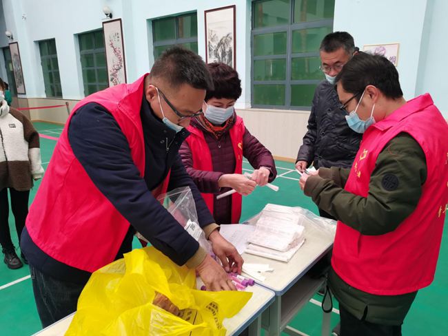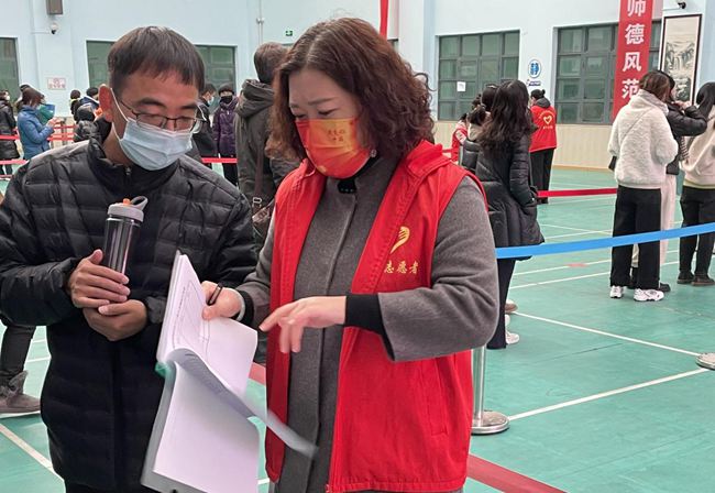 志愿者分工明确、职责清晰。每一次核酸检测前,他们都会提前到达检测地点,组织教职工有序排队、分组登记并提前做好检测准备工作。为提高检测效率,志愿者协助国药一机医院工作人员拆除口咽拭子外包装,标记整理标本采集试管,460人核酸采集在一小时内高效完成,信息录入也在同步进行。