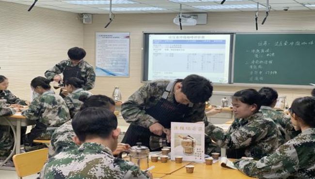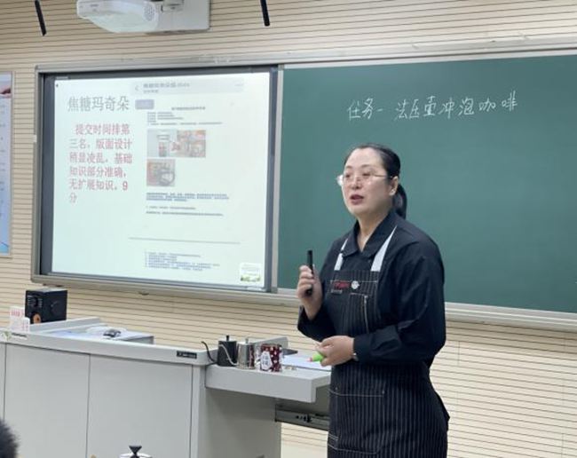 霍丽红老师执教的课程是《法压壶冲泡咖啡(第一课时)》。她通过“翻转课堂”、“学案探索”等新颖的环节,向大家展示了以学生为主体、教师为主导的课堂。霍老师将本节课分为六个环节并精心设计了评分栏,其中有一个环节是:赛一赛,在这个环节,小组分工明确,配合默契,每个小组选派代表参加法压壶冲泡咖啡比赛,小组代表展示后,其他小组的同学根据霍老师给他们出示的点评表对各小组代表的作品进行点评,霍老师做了最后的总结点评,整个活动学生参与度很高,积极性也很强。